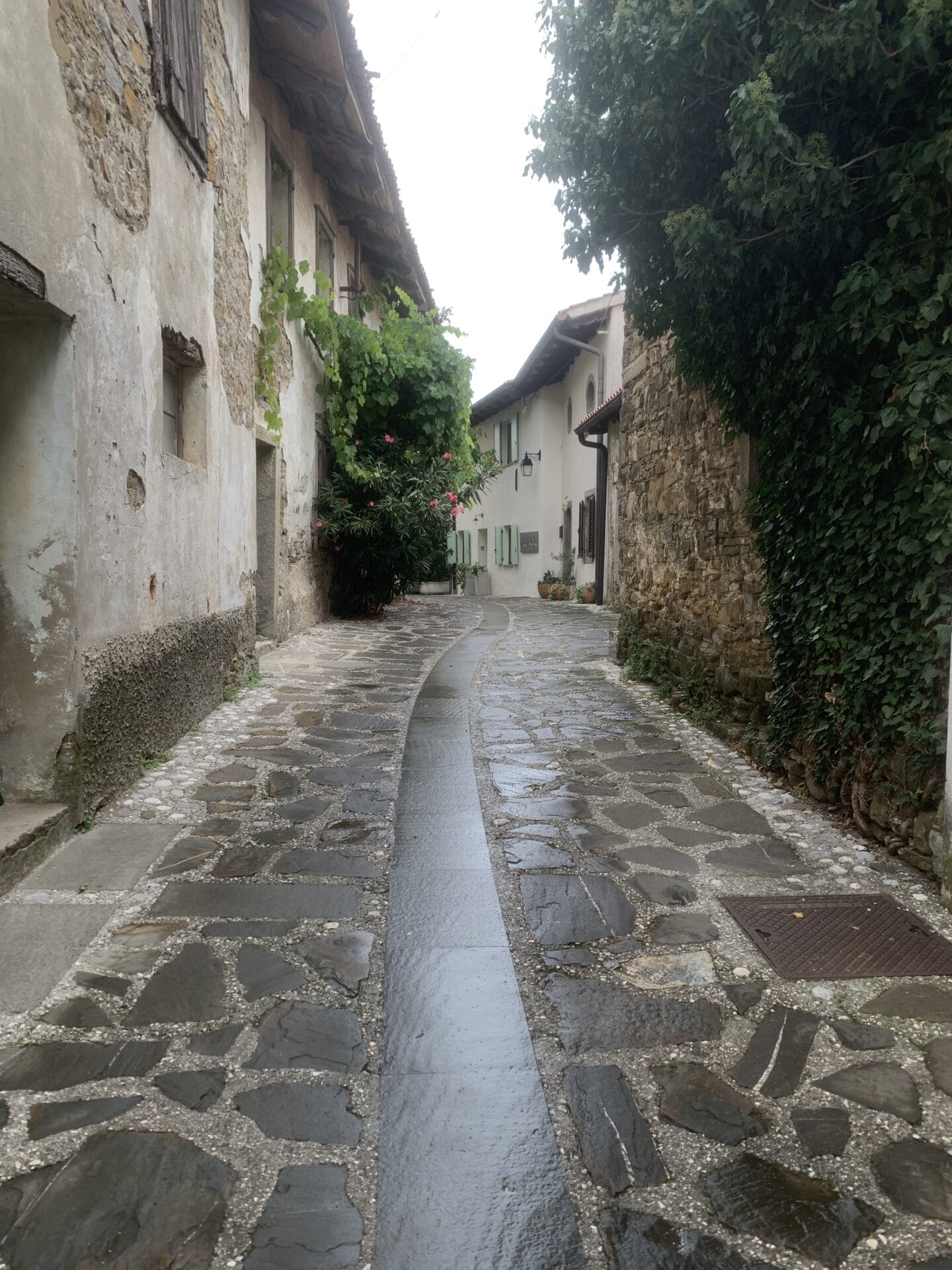 We then toured the small town of Šmartno located in Brda Slovenia wine country. It was a camping-style settlement from around the Roman times, with the village first mentioned in 1317. We took in the stone walkways lined with grape trellises and ancient, twisting olive trees. The trees had green fruit on them, which won’t be harvested until this fall. We saw farmers driving around with their tractor buckets filled with grapes.