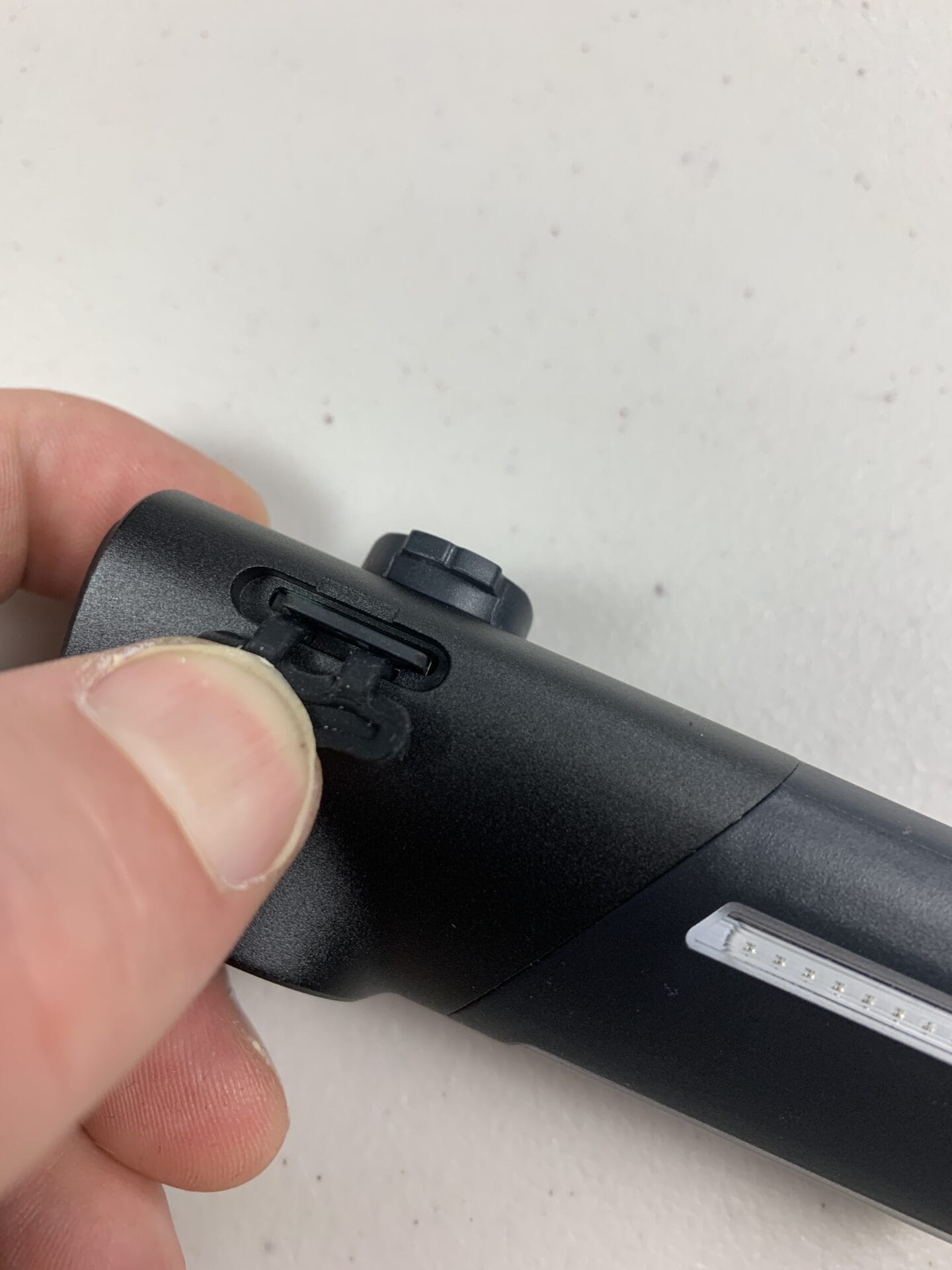 Pull back the rubber cover to expose the USB-C charging port. When looking at the taillight the charge port is on the left side. Once charged, insert the rubber cover to protect from water intrusion.