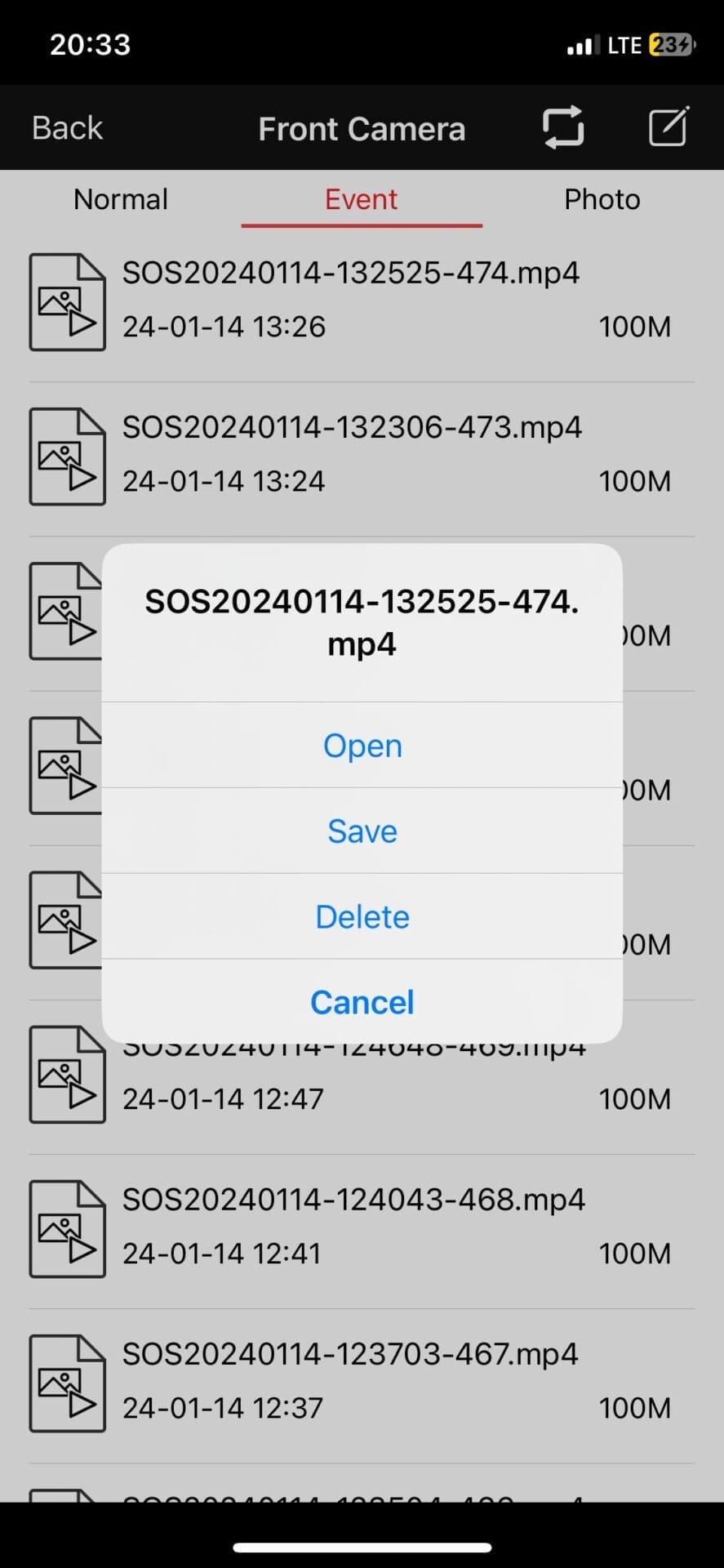 When an incident occurs, 5 seconds before the incident and 55 seconds after the incident are saved. By default, all recordings are 1 minute long, but this can be changed in the app.